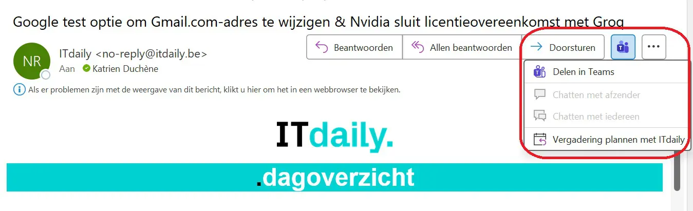 Inversement, c’est bien sûr également possible. Depuis Microsoft Teams, vous pouvez partager une copie d’un message de chat via Outlook. Pour ce faire, cliquez sur le message de chat que vous souhaitez partager, puis sur les trois points. Un menu apparaît dans lequel vous pouvez sélectionner Partager dans Outlook.