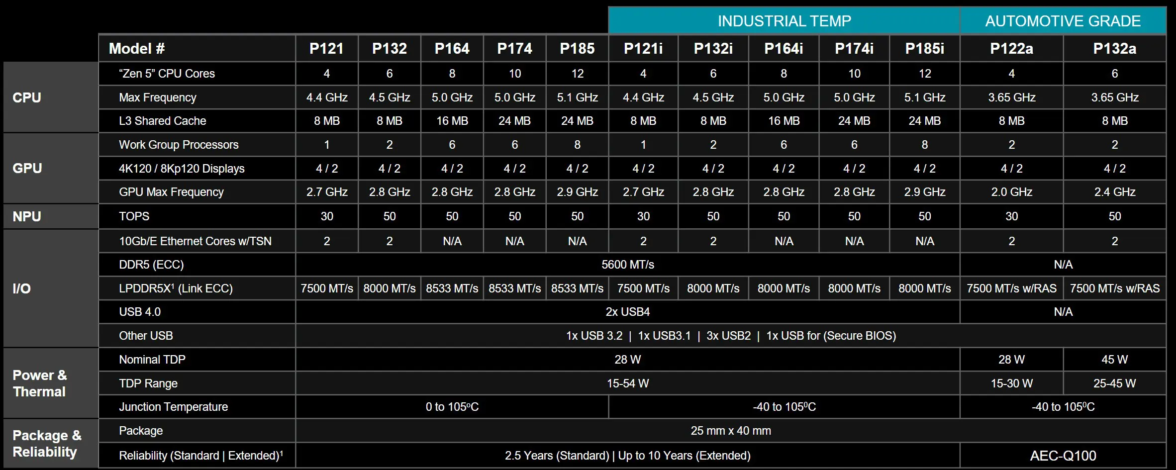 AMD construit ces puces sur l’architecture Zen 5, désormais très éprouvée. La gamme se compose de douze variantes, allant de quatre à douze cœurs de calcul au maximum. Le modèle phare, le Ryzen AI Embedded P185, dispose de douze cœurs cadencés à 4,8 GHz, de 8 Mo de cache L3 et d’un TDP de 28 watts.