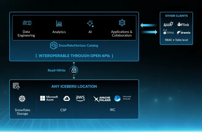 Snowflake a également annoncé des fonctions améliorées concernant la gestion des données et l’interopérabilité. Horizon Catalog permet d’appliquer la gouvernance aux données consultées via d’autres moteurs.