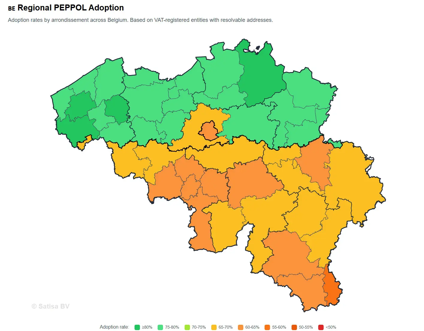Bien que l’adoption de Peppol ait connu une nette augmentation ces derniers mois, il existe une différence notable entre les régions de Belgique. La majorité des enregistrements Peppol se trouvent dans la province de Flandre. L’adoption à Bruxelles et en Wallonie est plutôt faible.